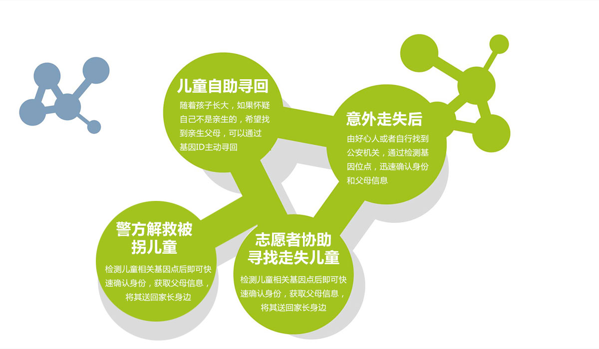 检测儿童相关基因位点后即可快速确认身份,获取父母信息,将其送回家长身边