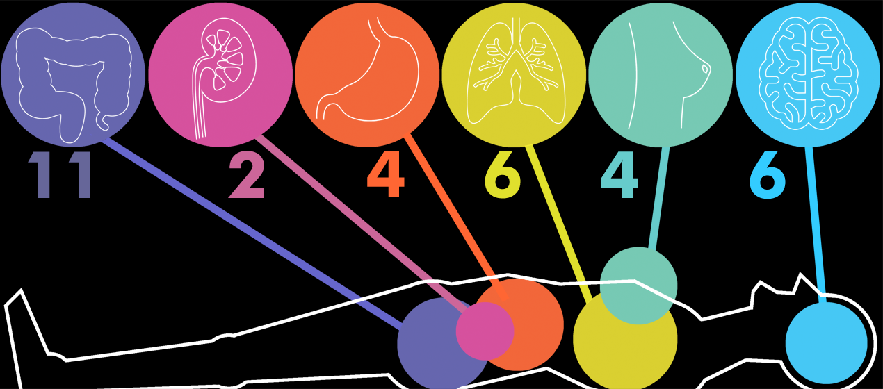 Approximate number of driver mutations needed to cause cancer by area of the body(图片来源:Wellcome Trust Sanger Institute)